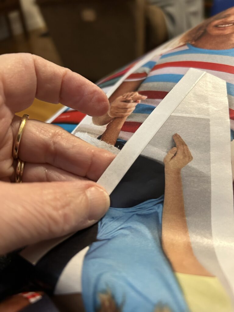 Now’s the tricky part. Choose an image you want to turn into decorative tape. You have to put the tape on the BACK of the image. (A light box would’ve been helpful, but I was too lazy to go hunt mine. A tablet or iPad set on a white screen might have worked as well, but I just thought of that.)