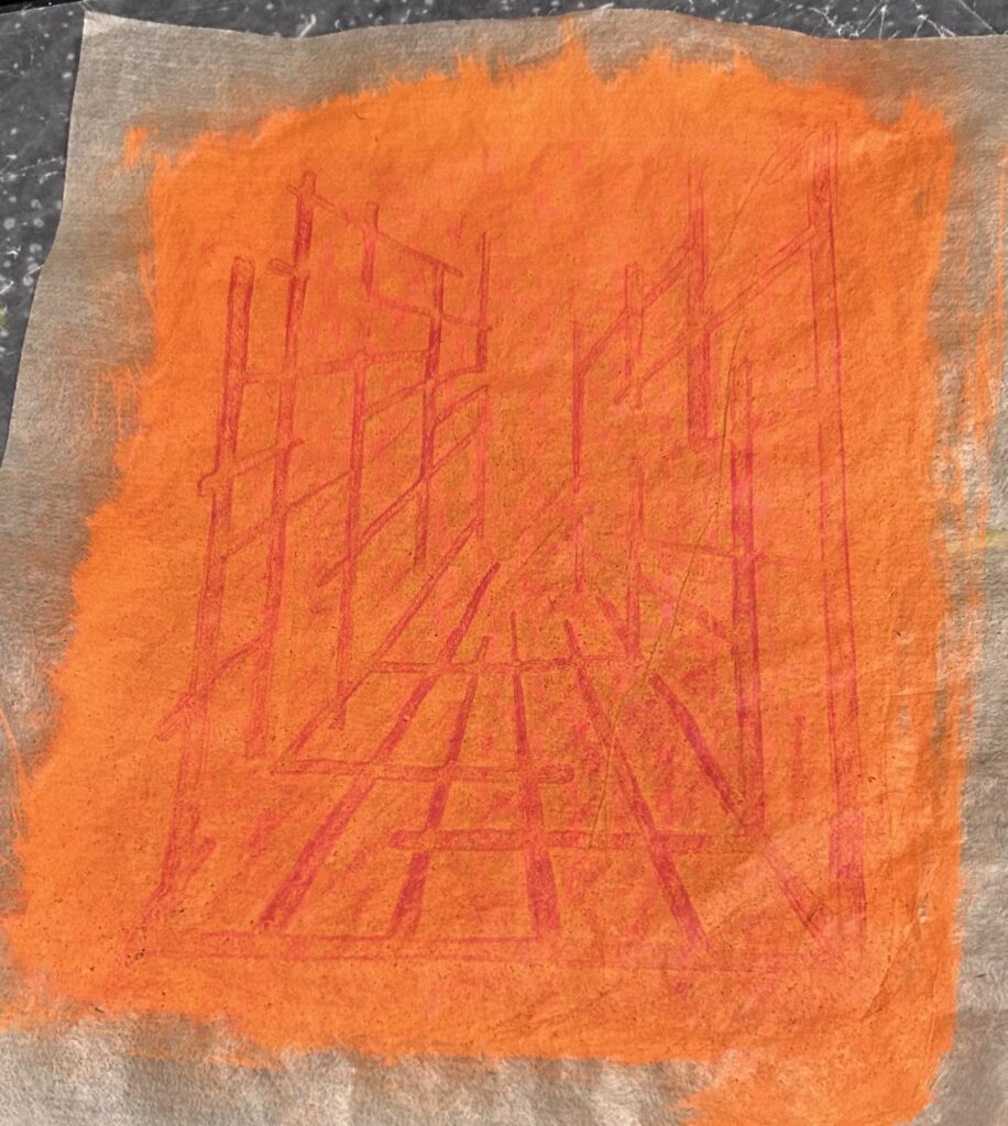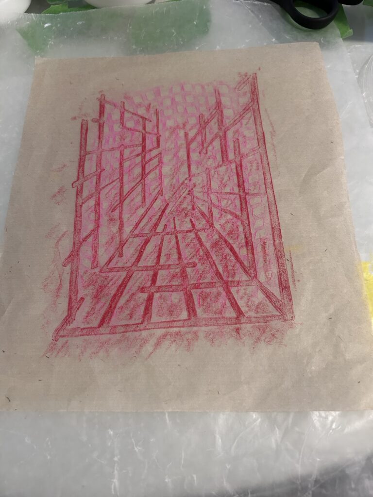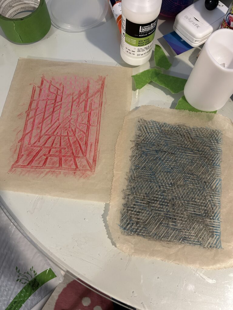 I love this technique! You do two wax rubbings with two different colored crayons using two different stencils, on the same sheet of translucent paper! Then, you spray or stain the back of the paper with a third color!