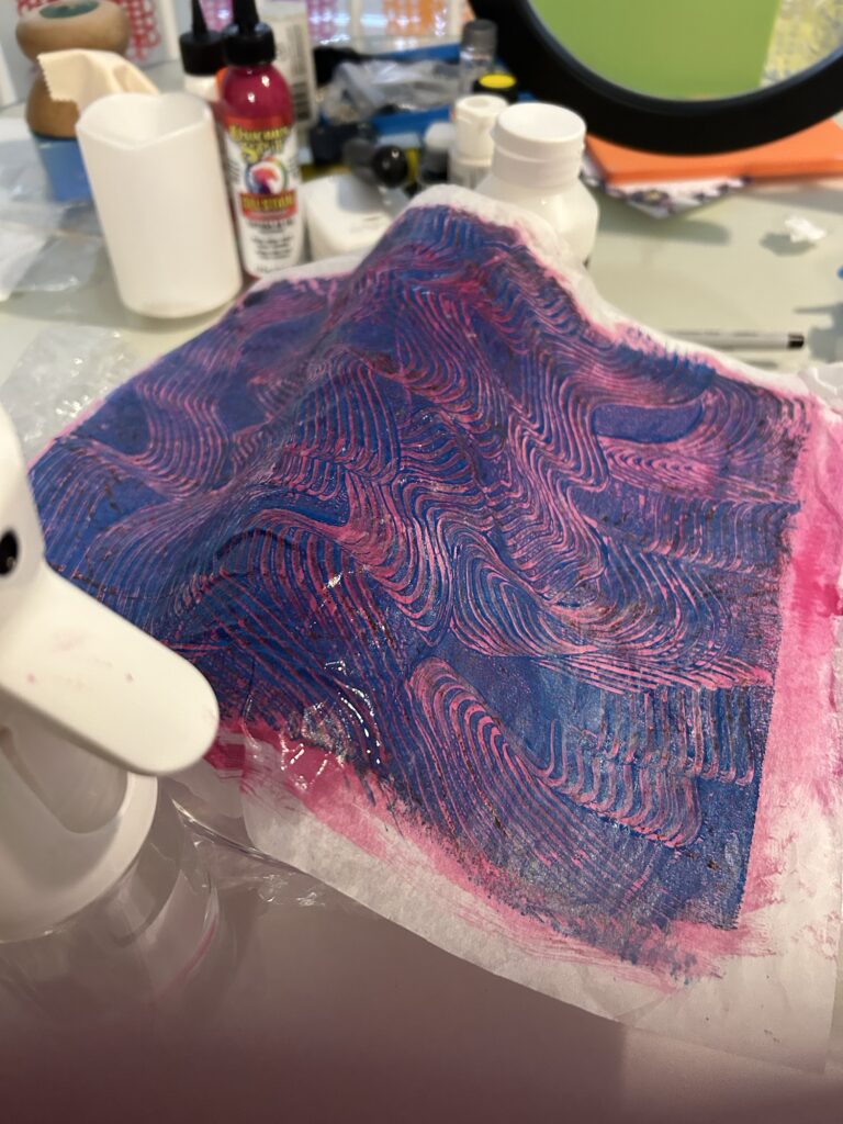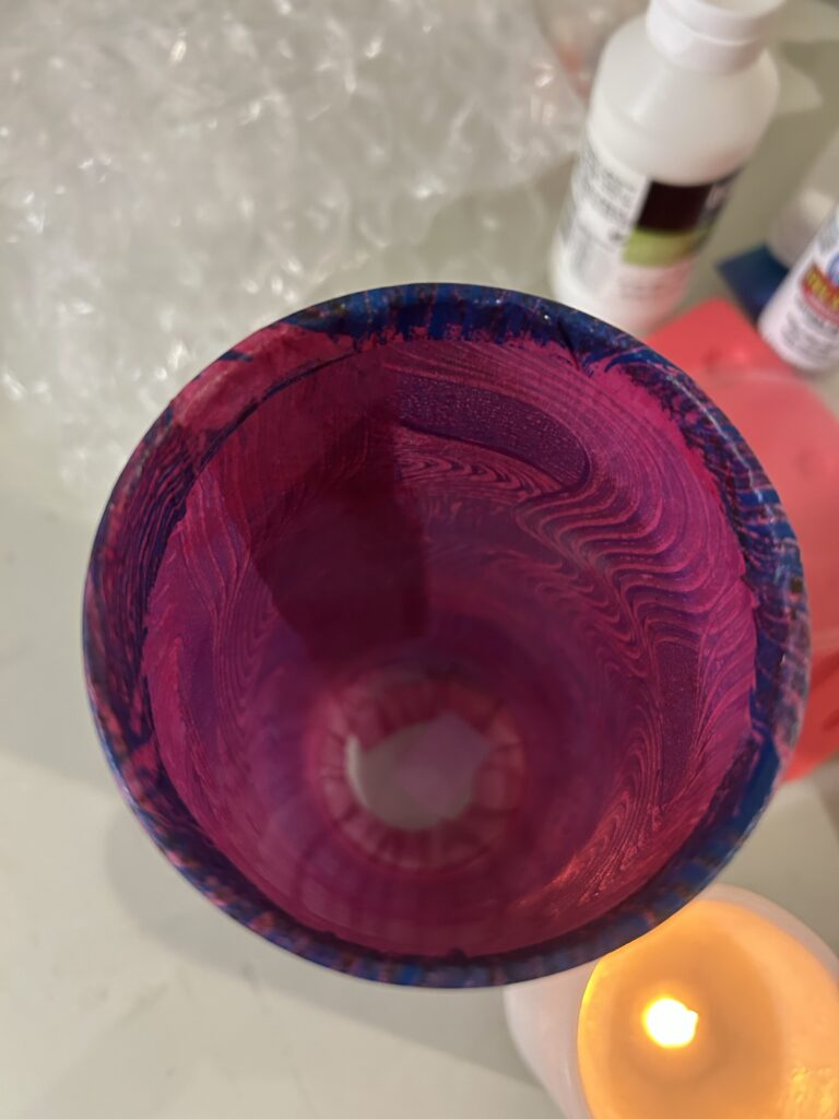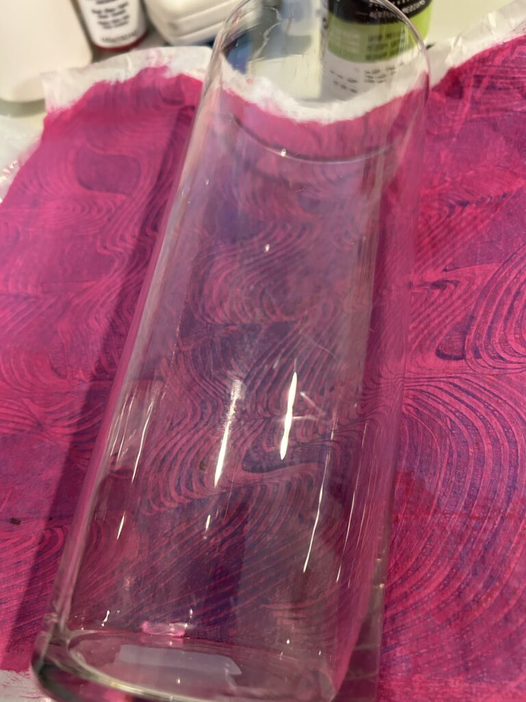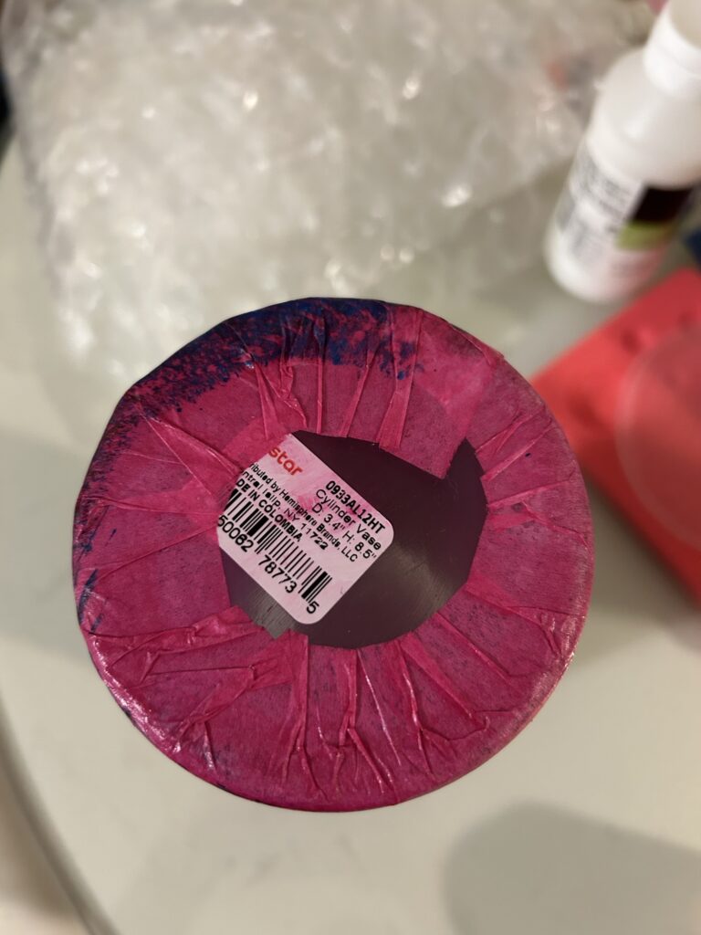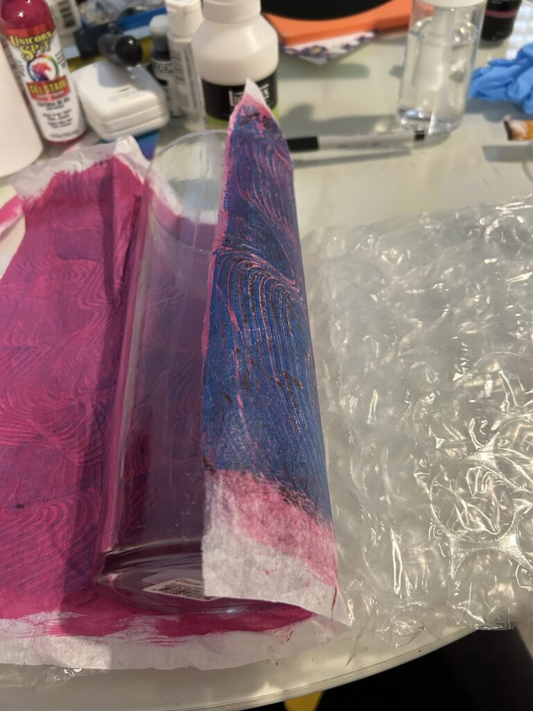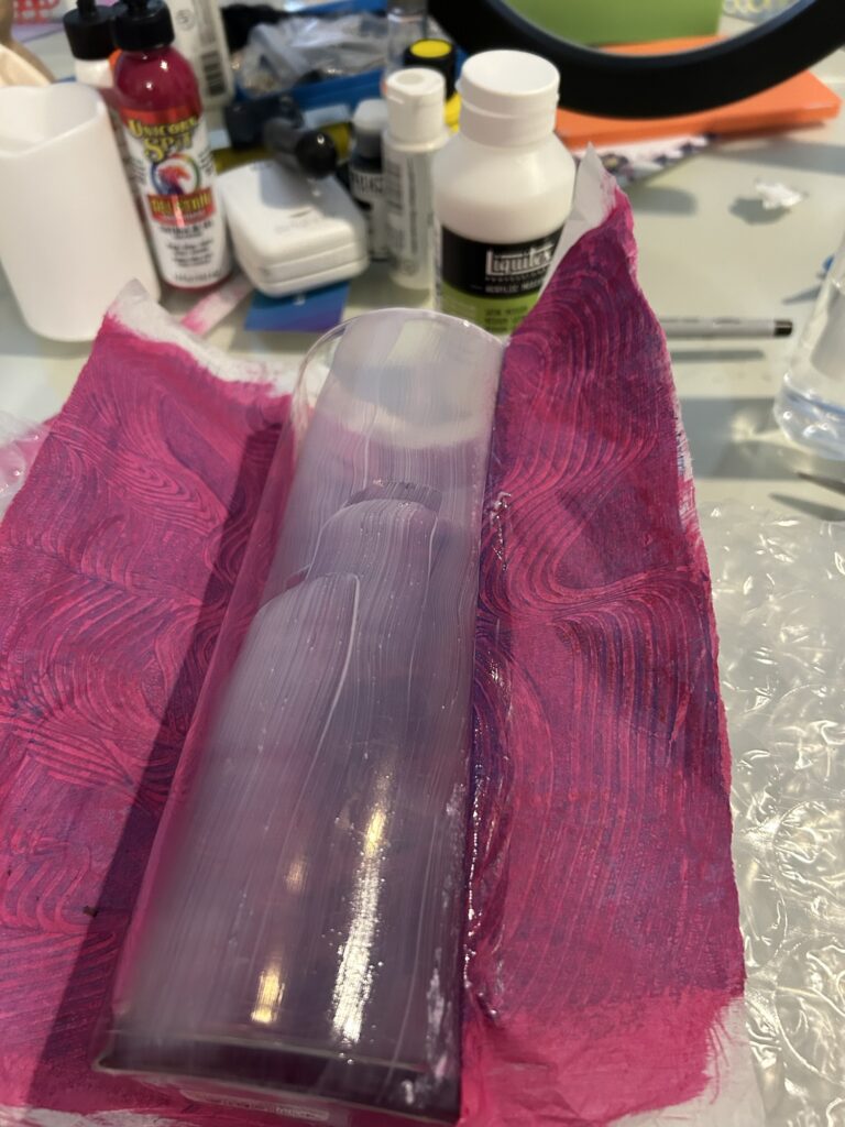 I bought a glass cylinder vase and an electric candle from Dollar Tree. The Unicorn Spit was a previous clearance purchase from Michael’s. I used a foam brush and spread the Unicorn Spit on the back of the tissue. Unicorn Spit is a water-based gel stain. The color is Party Punk Pink and it is intense! The tissue dried like this: