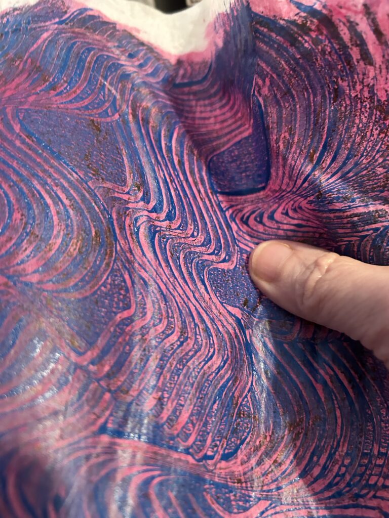 It’s a gel print by Patricia Carmichael Cline of PMartist Studios. I won it in a drawing, along with a whole pack of papers and stencil pieces. I remember when Patricia printed it. She used acrylic paint and a comb-like tool to make the swirls. She pulled it with wet strength tissue. I liked the transparency of the tissue and got an idea.