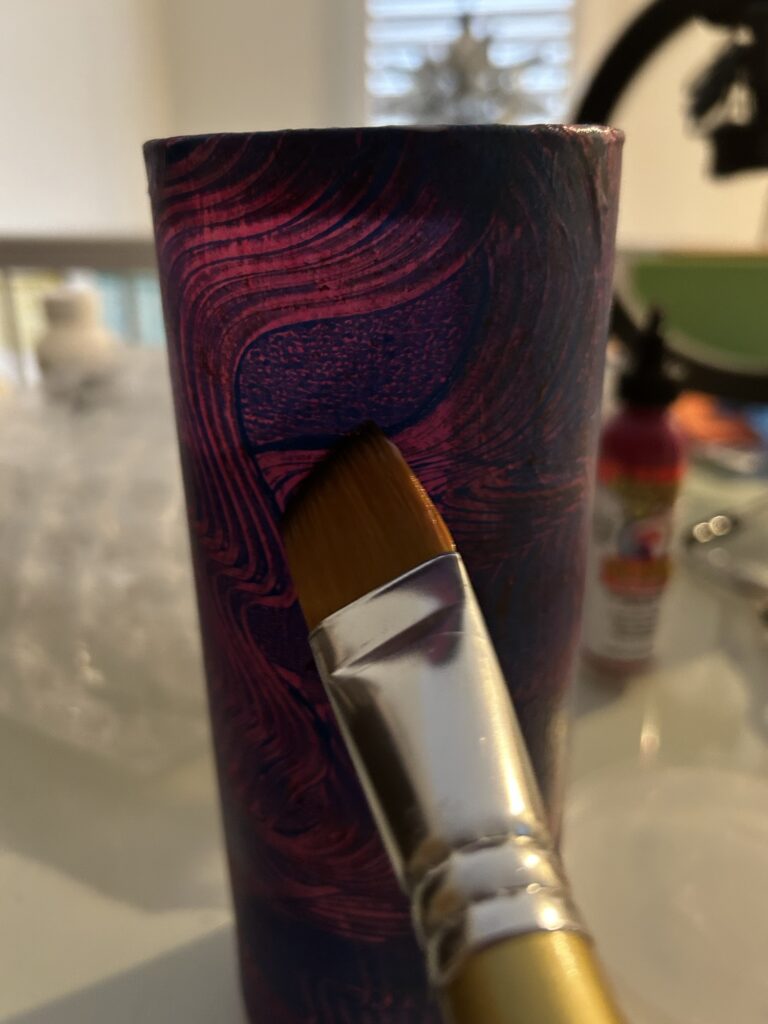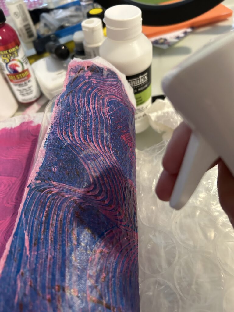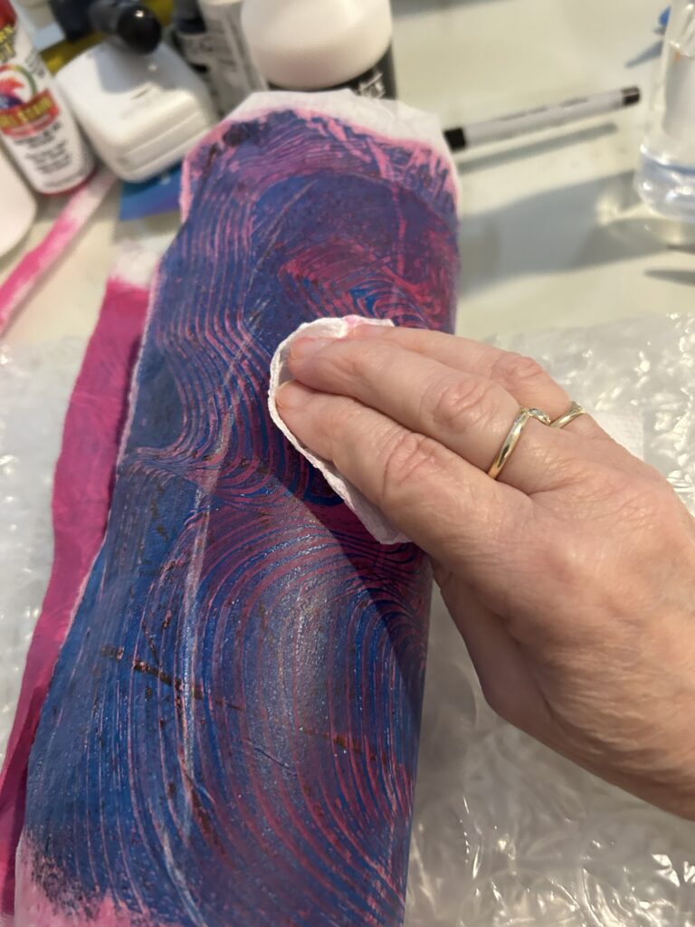 Since the cylinder is round, I made it a cradle of big bubble wrap. I painted on a thin layer of gel medium, just on the exposed surface. I used a soft, wide bristle brush.