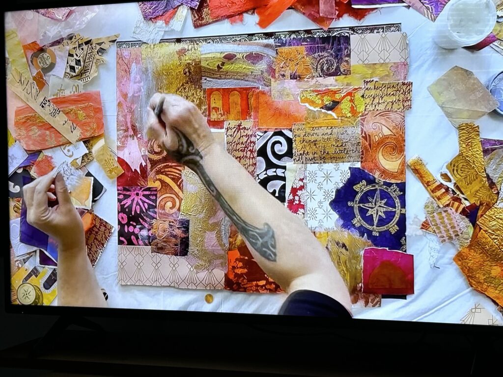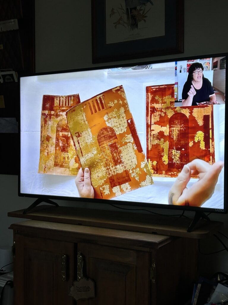 To learn how to transfer images onto the gel plate, be sure to watch this episode. Warning: she makes it look easy. It’s not! I’ve had two successful image transfers. I’ll share them another time.