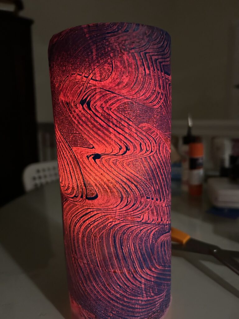 I love this technique! You do two wax rubbings with two different colored crayons using two different stencils, on the same sheet of translucent paper! Then, you spray or stain the back of the paper with a third color!